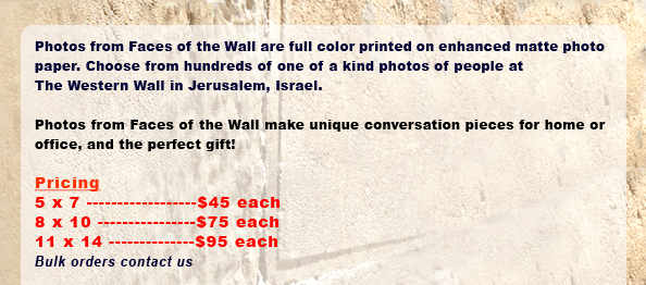 All images appearing on the Faces of the Wall website www.facesofthewall.com are the exclusive property of Mordy Mehlman, and may not be reproduced, copied or manipulated in part or entirety without written approval from Mordy Mehlman and payment of a license fee.